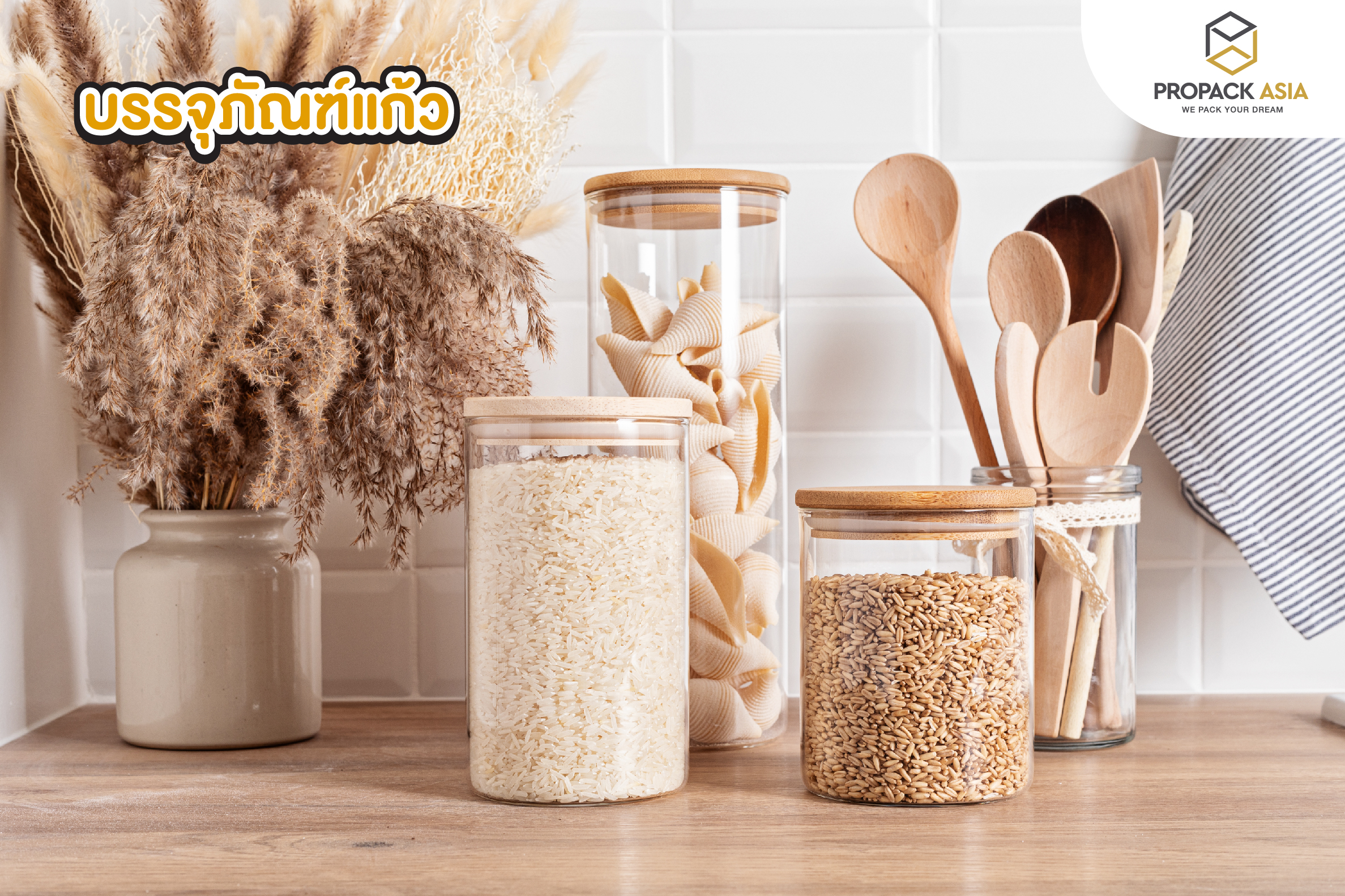 ต่อกันด้วยแพคเกจจิ้งเพื่อเพิ่มความสวยงาม และความหรูหราสินค้ามากขึ้น นอกจากนั้นเป็นวัสดุที่มีความทนทานต่อความร้อน และความเย็น การขึ้นรูปสามารถเพิ่มสีสัน ลวดลายต่าง ๆ ได้ตามความต้องการของแบรนด์ได้เลย เพียงแค่ข้อเสียคือจะไม่ค่อยเป็นมิตรกับการขนส่งเท่าไหร่นัก เพราะมีโอกาสเสียหายได้ง่าย ยกตัวอย่างผลิตภัณฑ์ที่ใช้แก้วเป็นแพคเกจจิ้งคือ บรรจุภัณฑ์เครื่องสำอาง สำหรับบริษัทรับบรรจุครีมเครื่องดื่มชูกำลัง เบียร์ เหล้า ยาและเวชภัณฑ์ ฯลฯ