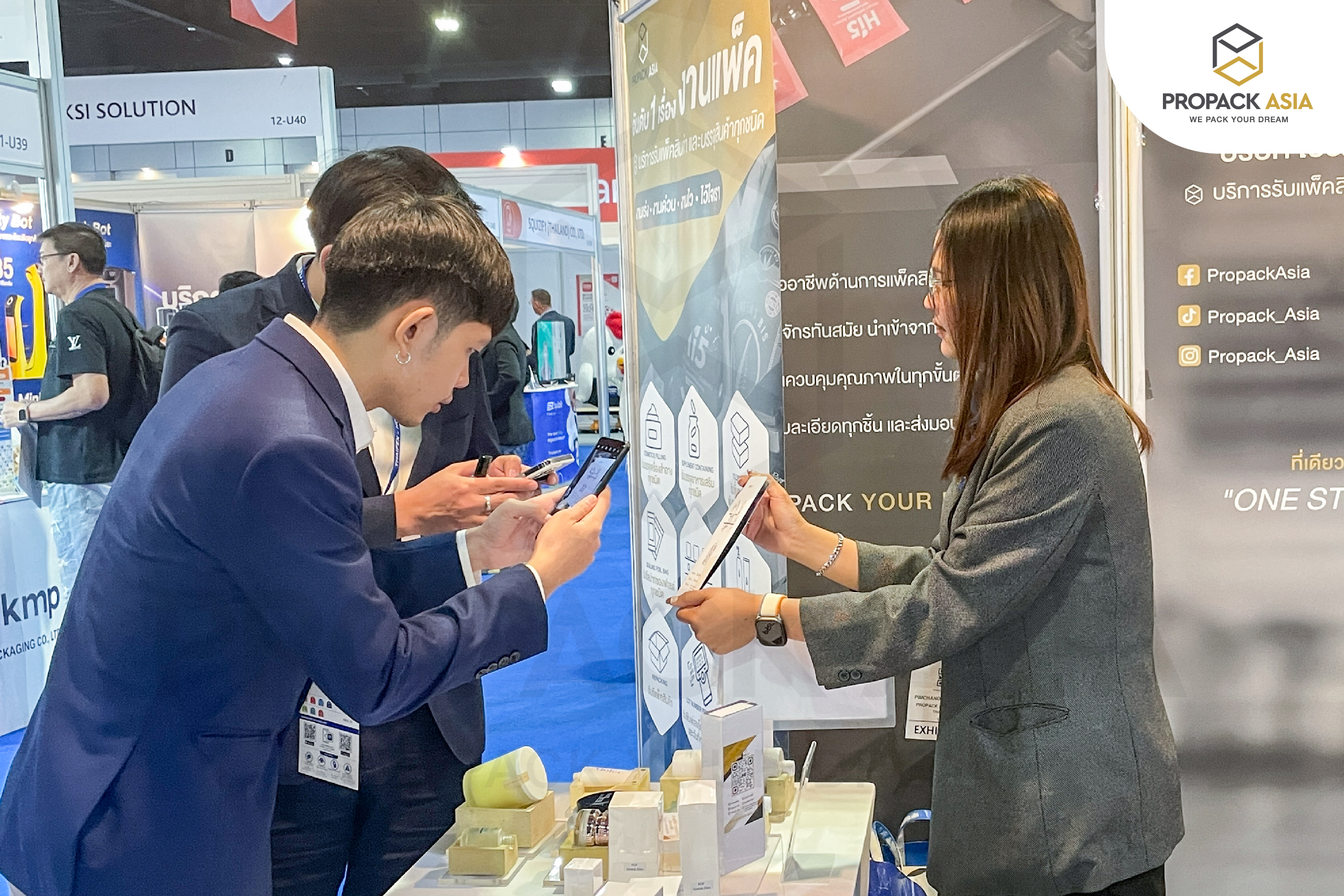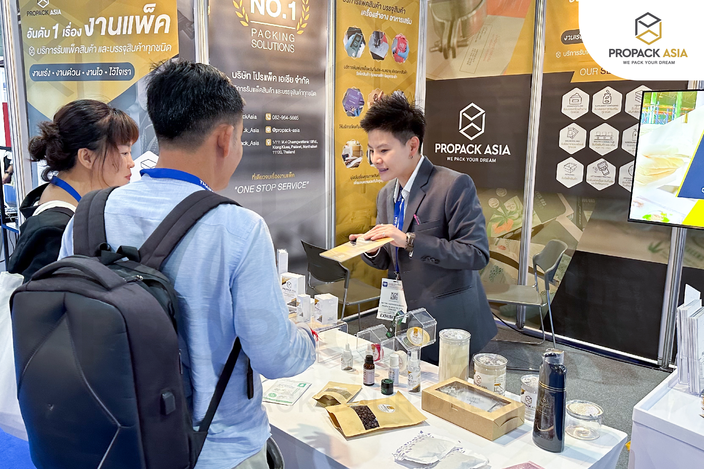 ในงานนี้ ProPack Asia นำตัวอย่างผลงานบริการของเราไปโชว์หลากหลายรูปแบบ ไม่ว่าจะเป็นบริการรับบรรจุครีม และเครื่องสำอางทุกชนิด (Cosmetics Filling), บริการรับบรรจุอาหารเสริม และแพ็คอาหารเสริมทุกชนิด (Supplement Containing), บริการรับขึ้นรูปกล่อง และพับกล่องทุกรูปแบบ (Folding Box), บริการรับซีลปากซองฟอยล์ทุกชนิด (Sealing Foil Bag), บริการรับซีล และชริ้งสินค้าทุกชนิด (Sealing & Shrink Film), บริการรับพิมพ์เลขล็อต วันที่ผลิต และวันหมดอายุ (Lot Number Printing), บริการรับสกรีนบรรจุภัณฑ์ทุกชนิด (Screen Printing Service), บริการรับผลิต และติดฉลากสินค้าบนบรรจภัณฑ์ (Product Labeling & Sticker Service) และบริการรับรีแพ็คสินค้า (Repacking) พร้อมโปรโมชั่นพิเศษประเมินราคาฟรี! จัดส่งฟรี! สำหรับลูกค้าที่จองสิทธิ์ภายในงานนี้เท่านั้น