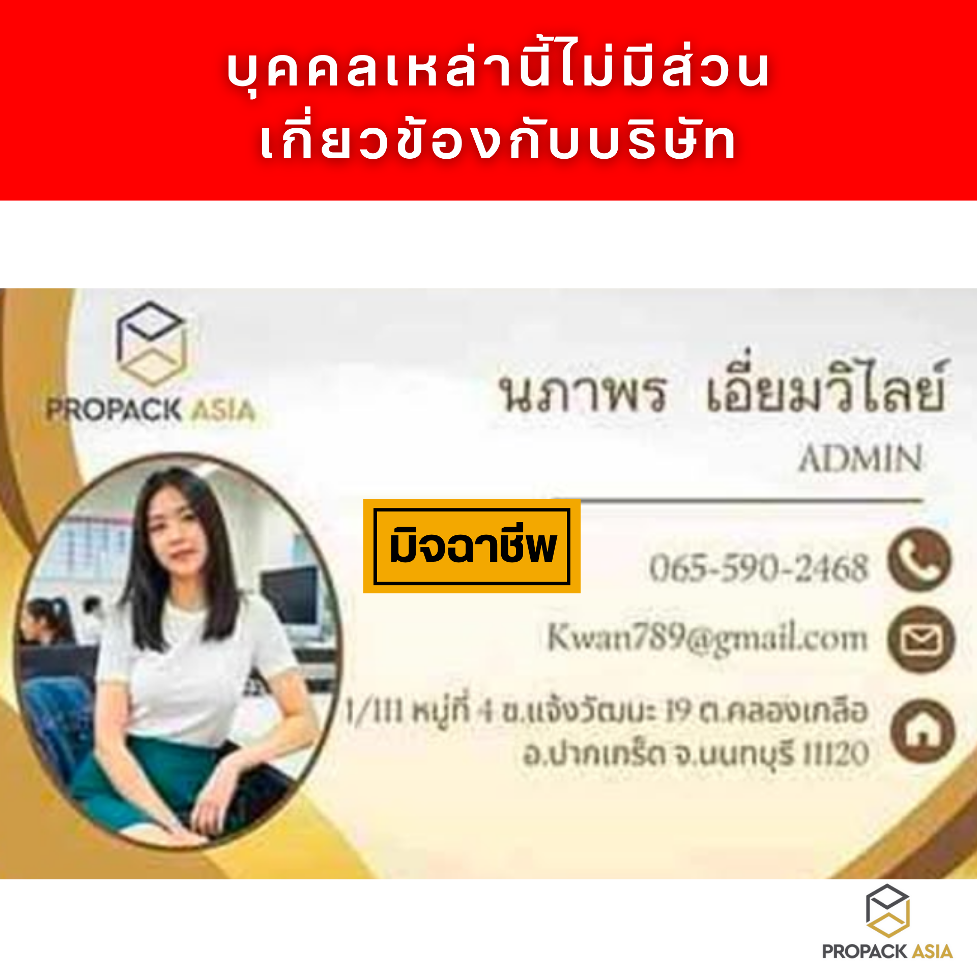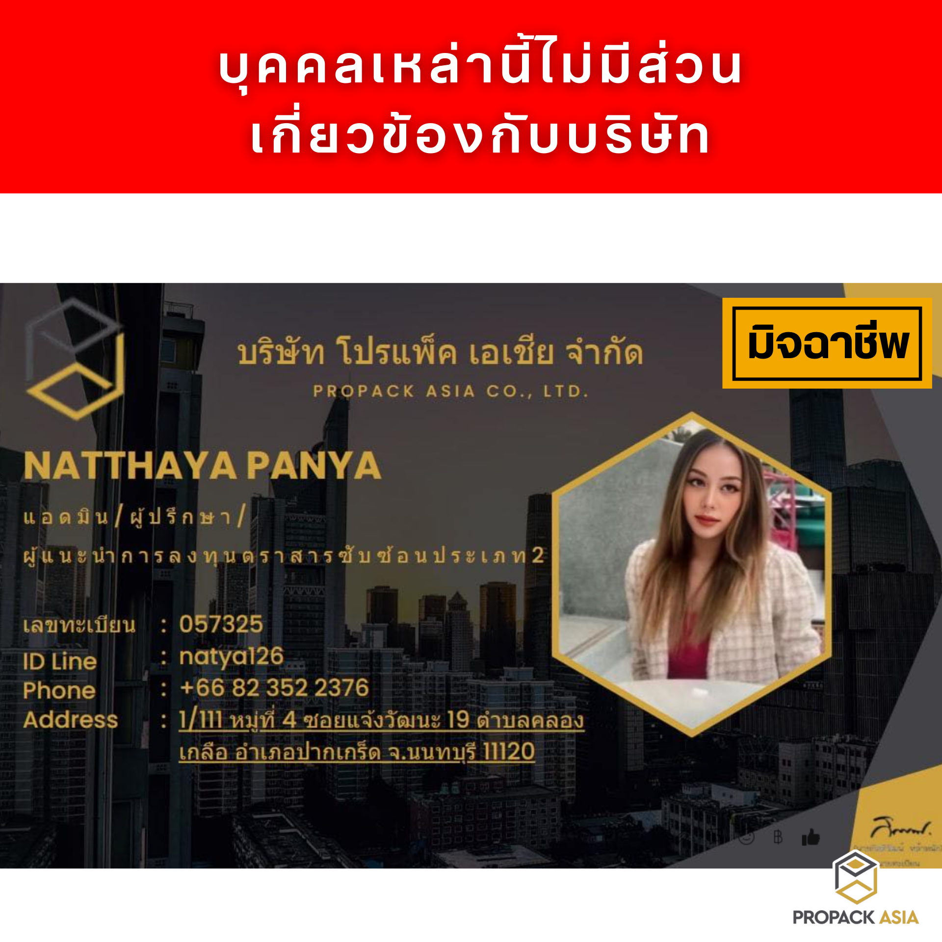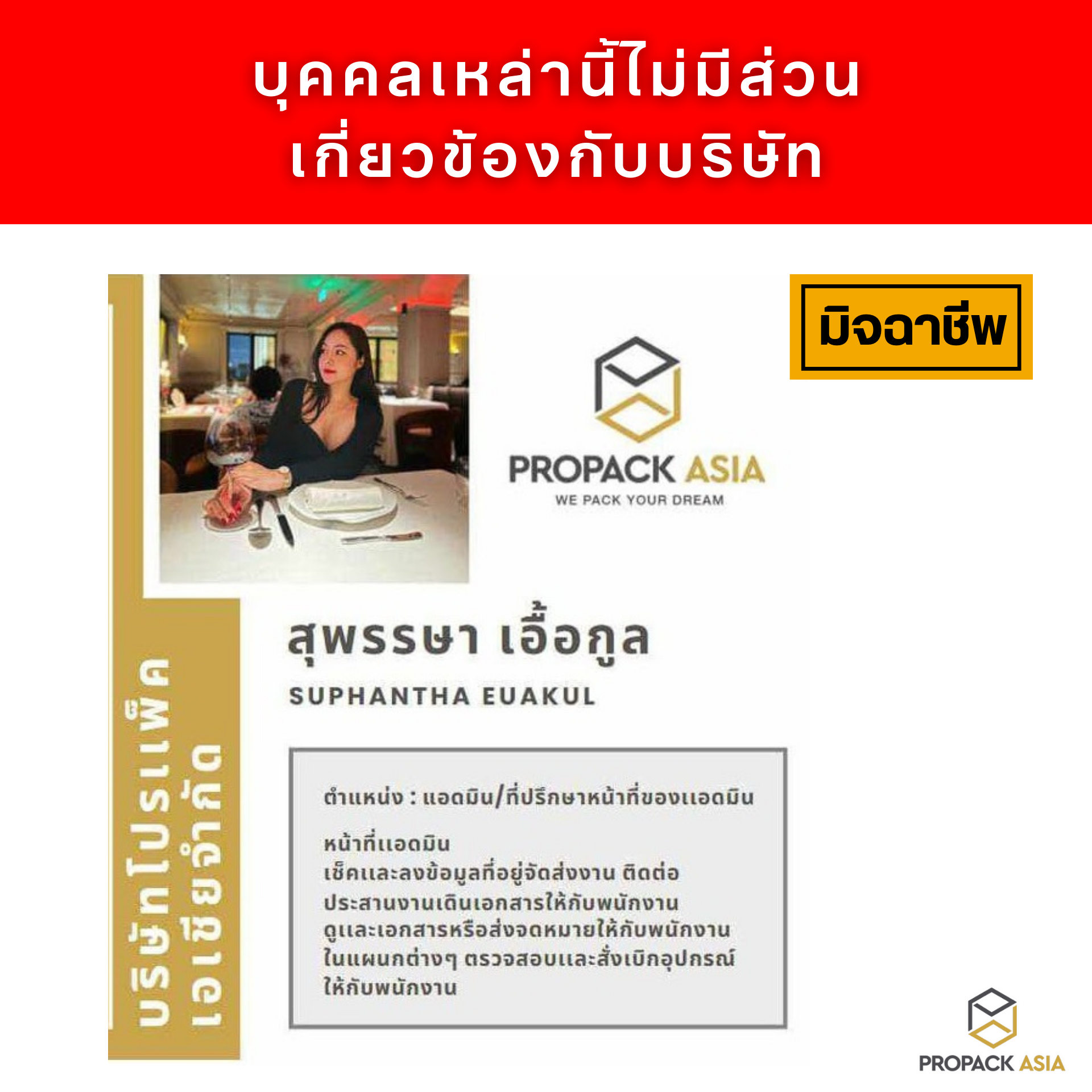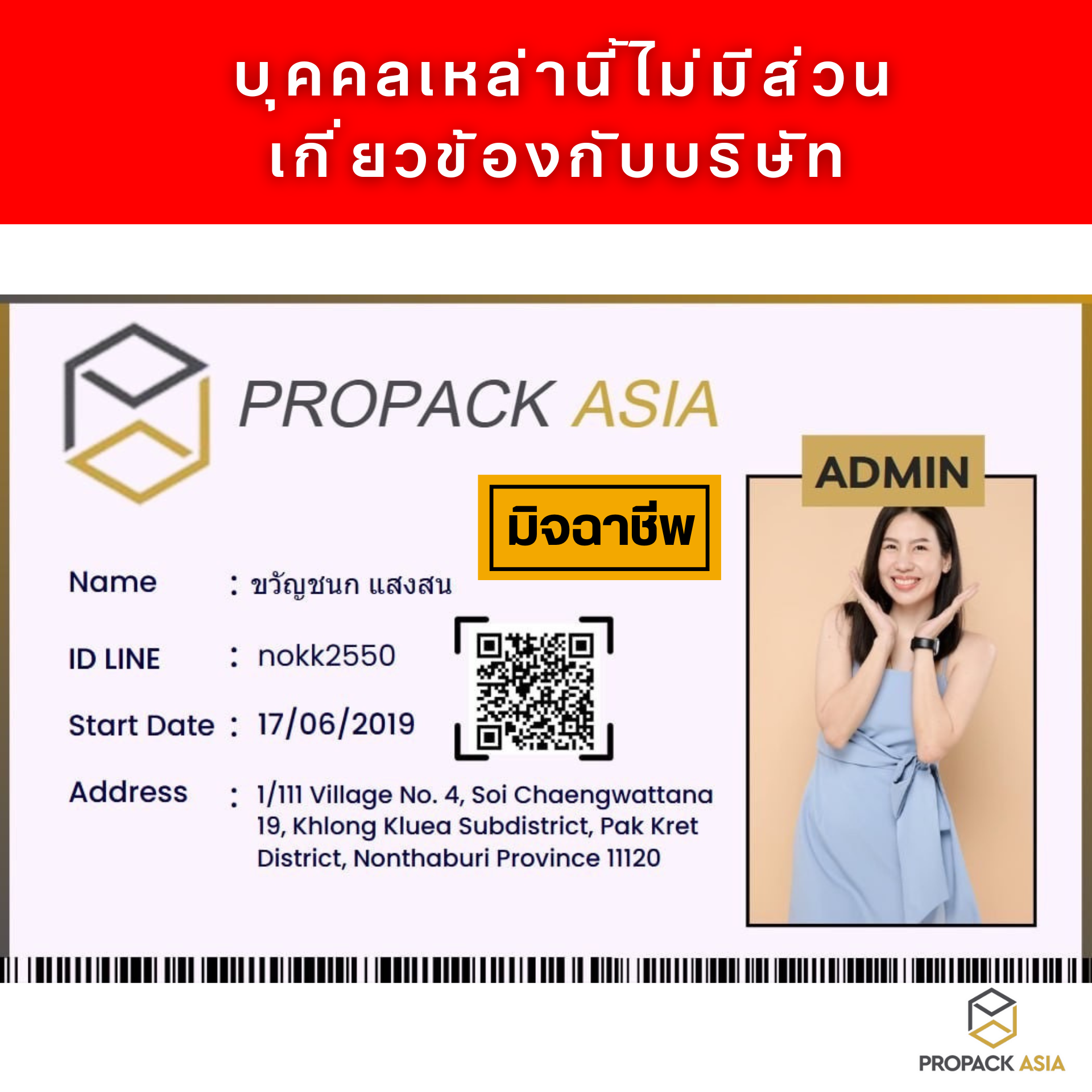 เนื่องจากในขณะนี้มีมิจฉาชีพ แอบอ้างชื่อของบริษัท โปรแพ็ค เอเชีย จำกัด โดยการเปิดเพจ Facebook หลอกผู้ที่สนใจ ให้เข้ากลุ่มไลน์ หลอกว่ารับสมัคร งาน ให้รับงานไปแพ็คที่บ้าน และให้โอนเงินค่าสมัครไปให้ยังบัญชีบุคคลต่างๆ