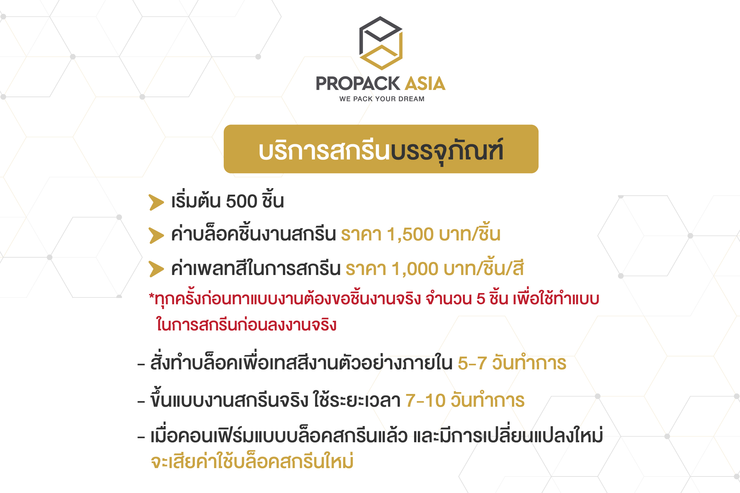 ProPack Asia บริการรับสกรีนบรรจุภัณฑ์ รองรับการผลิตทุกรูปแบบ ไม่ว่าจะเป็น สกรีนเครื่องสำอาง, สกรีนหลอดโฟม, สกรีนหลอดครีม, สกรีนกระปุก, สกรีนขวด และสกรีนซองฟอยล์ งานสกรีนมีคุณภาพสีสวยสด ไม่หลุดลอก ติดทน คมชัด ดูแลภายใต้การควบคุมคุณภาพมาตรฐาน ISO 9001:2015 ตลอดทั้งกระบวนการ สามารถรองรับงานของลูกค้าได้อย่างรวดเร็ว ไม่ว่าจะเป็นงานเล็ก 100 ชิ้น หรืองานใหญ่ 1,000,000 ชิ้น เราก็ทำทัน